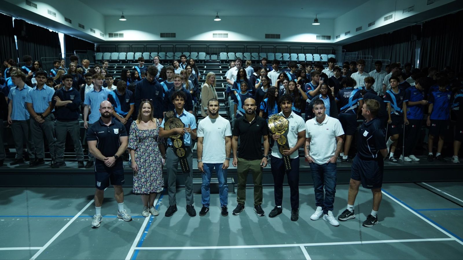 The special appearance by the world-class athletes drew cheers from students, who were thrilled to meet their mixed martial arts heroes in person.